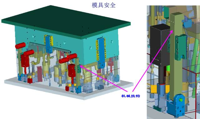 (1)第一級頂出采用4個油缸頂出同前模同步運動頂出60MM,4個拉鉤為輔助機構(gòu);