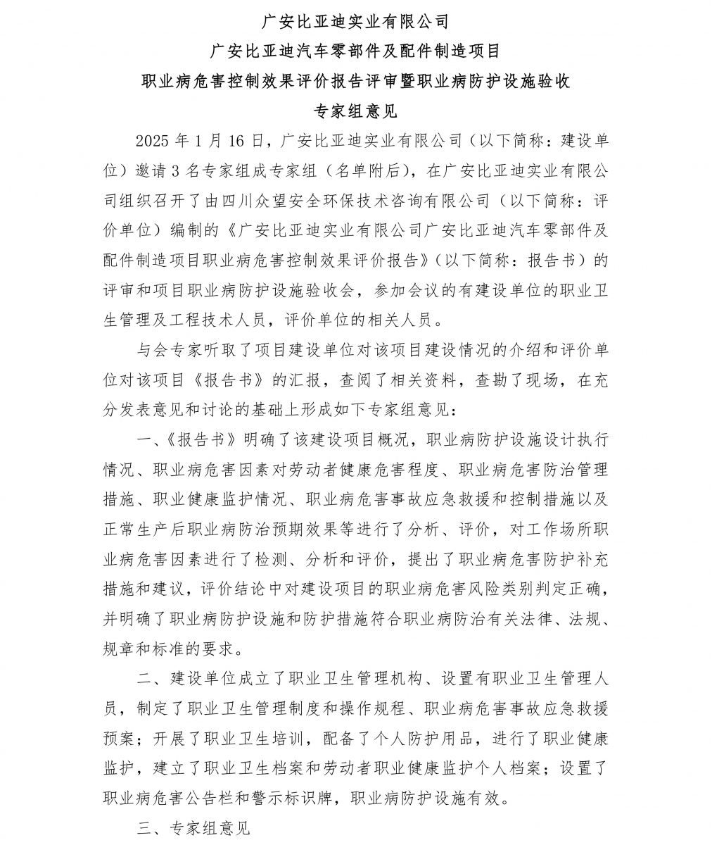 廣安比亞迪實業有限公司 廣安比亞迪汽車零部件及配件制造項目職控評
