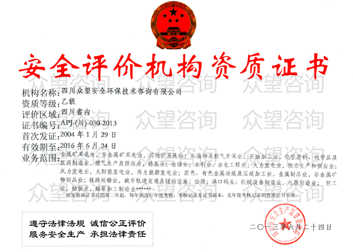 本公司于2004年取得安全評(píng)價(jià)機(jī)構(gòu)資質(zhì)證書,經(jīng)過十年發(fā)展,公司完成了數(shù)千項(xiàng)安全評(píng)價(jià)項(xiàng)目,積累了大量經(jīng)驗(yàn),匯聚了大量人才,現(xiàn)有國(guó)家注冊(cè)安全評(píng)價(jià)工程師41人,能從事金屬礦采選業(yè)、石油和天然氣開采業(yè)、化工及醫(yī)藥制造業(yè)、倉(cāng)儲(chǔ)業(yè)、水利業(yè)、輕工業(yè)等31個(gè)行業(yè)的建設(shè)項(xiàng)目的安全預(yù)評(píng)價(jià)、安全現(xiàn)狀評(píng)價(jià)、安全驗(yàn)收評(píng)價(jià)工作。