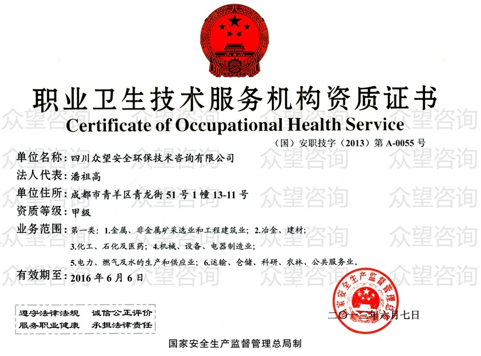 四川眾望自2010年取得職業(yè)衛(wèi)生技術(shù)服務(wù)機構(gòu)乙級資質(zhì)起即開始從事職業(yè)衛(wèi)生服務(wù)工作,于2013年6月7日取得職業(yè)衛(wèi)生技術(shù)服務(wù)機構(gòu)甲級資質(zhì)。在秉承“責(zé)任 規(guī)范 誠信 真相”的工作準則下,眾望迄今已順利完成1300余項建設(shè)項目職業(yè)病危害因素日常檢測、職業(yè)病危害預(yù)評價、職業(yè)病危害控制效果評價及職業(yè)病危害現(xiàn)狀評價。